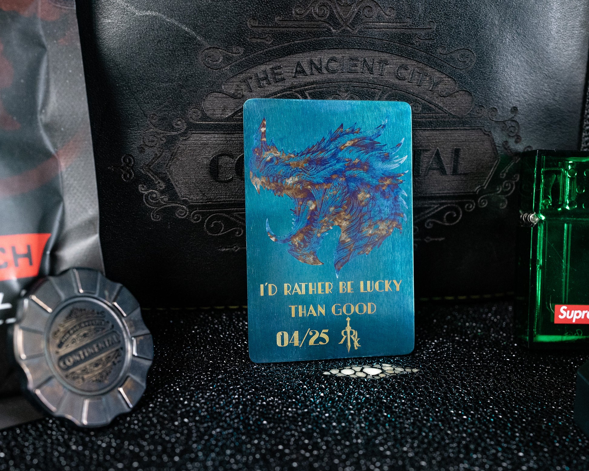 Titanium Business Card with intricate anodizing laser work a hand brushed ano makes all of Ruben's work unique! We love working with craftsmen and projects like these show why. Each of these cards are unique and numbered. Sign up to be notified when we release more.